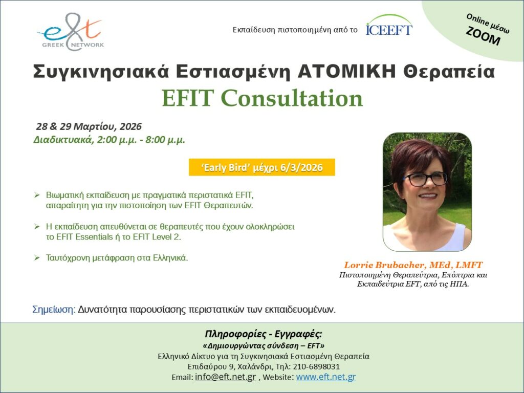 Ανακοινώθηκε η εκπαίδευση στην Συγκινησιακά Εστιασμένη ΑΤΟΜΙΚΗ Θεραπεία – EFIT Consultation και αφορά θεραπευτές που έχουν ολοκληρώσει το EFIT Essentials ή το EFIT level 2.